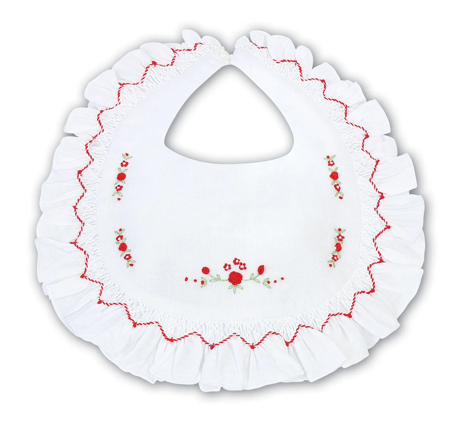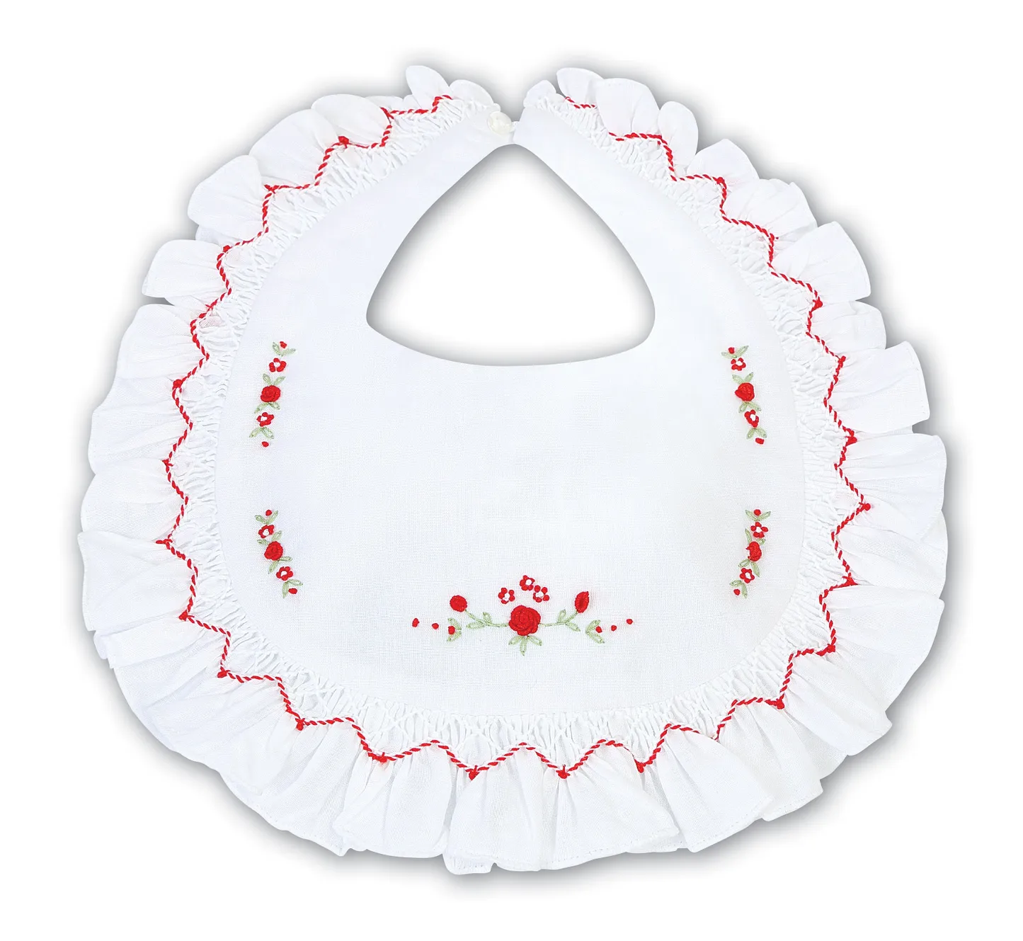 Our Baby bibs in classic colours which matches all Baby Dresses within the Collection. A beautiful hand-smocked trim with delicate hand-embroidered flowers. Matching booties & bonnets also available creating the perfect finish to any Sarah Louise outfit or excellent new baby gifts.