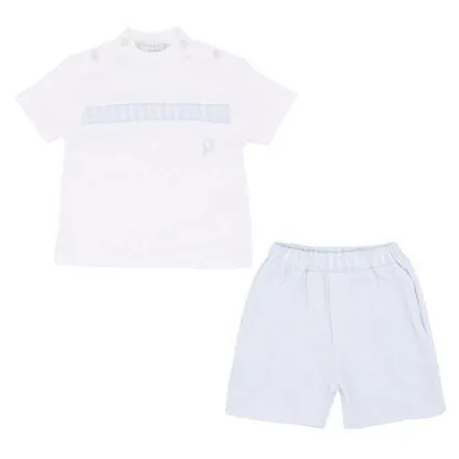 Pastels & Co boys cotton white and blue t-shirt short set with round neck, press stud fastenings and blue stripe detail across front of t-shirt.