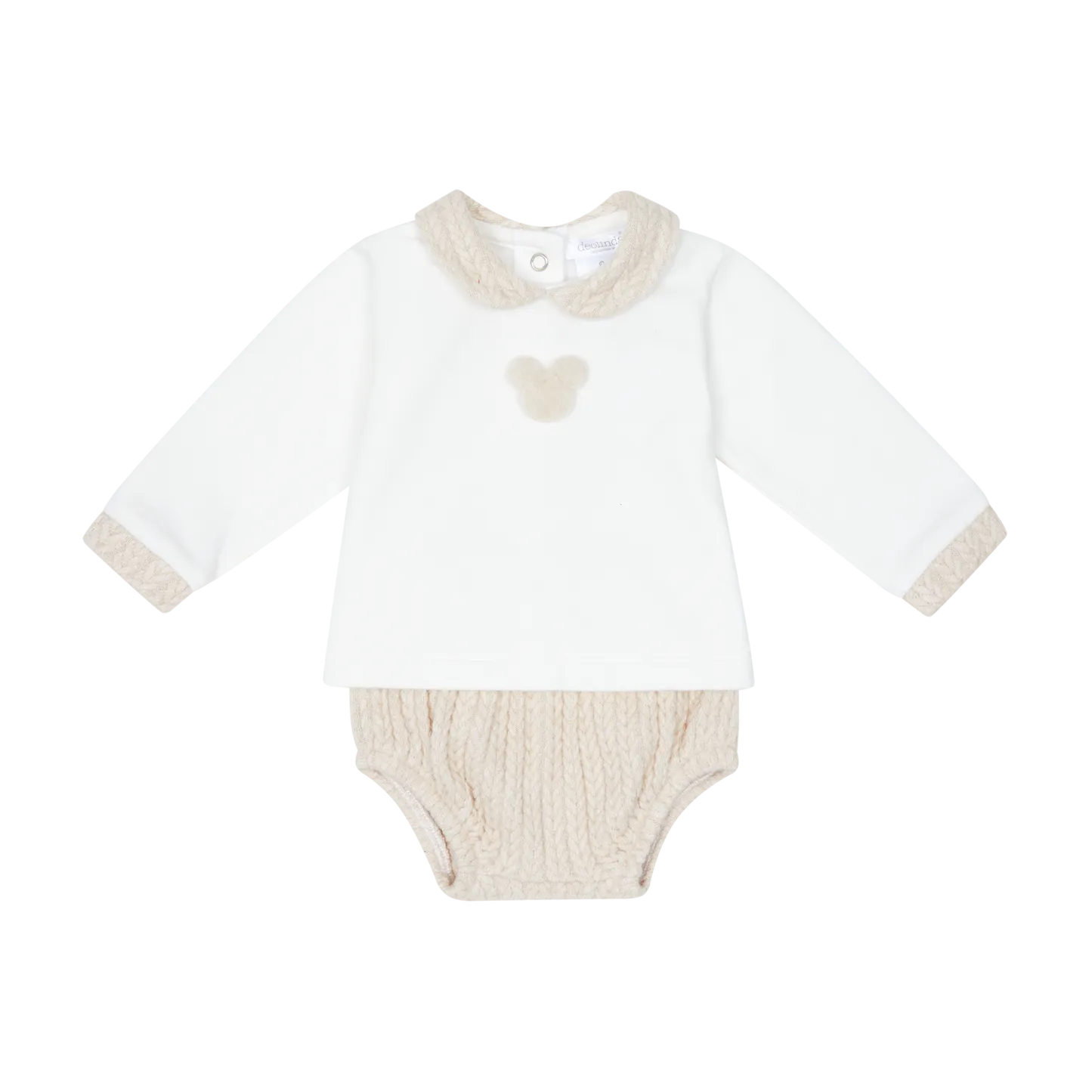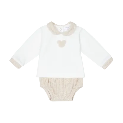 New In from Deolinda unisex beige "woody" jam pant set. Beige jam pants with cream top. Round beige "woody" collar and trim to cuffs. Matching dress available.