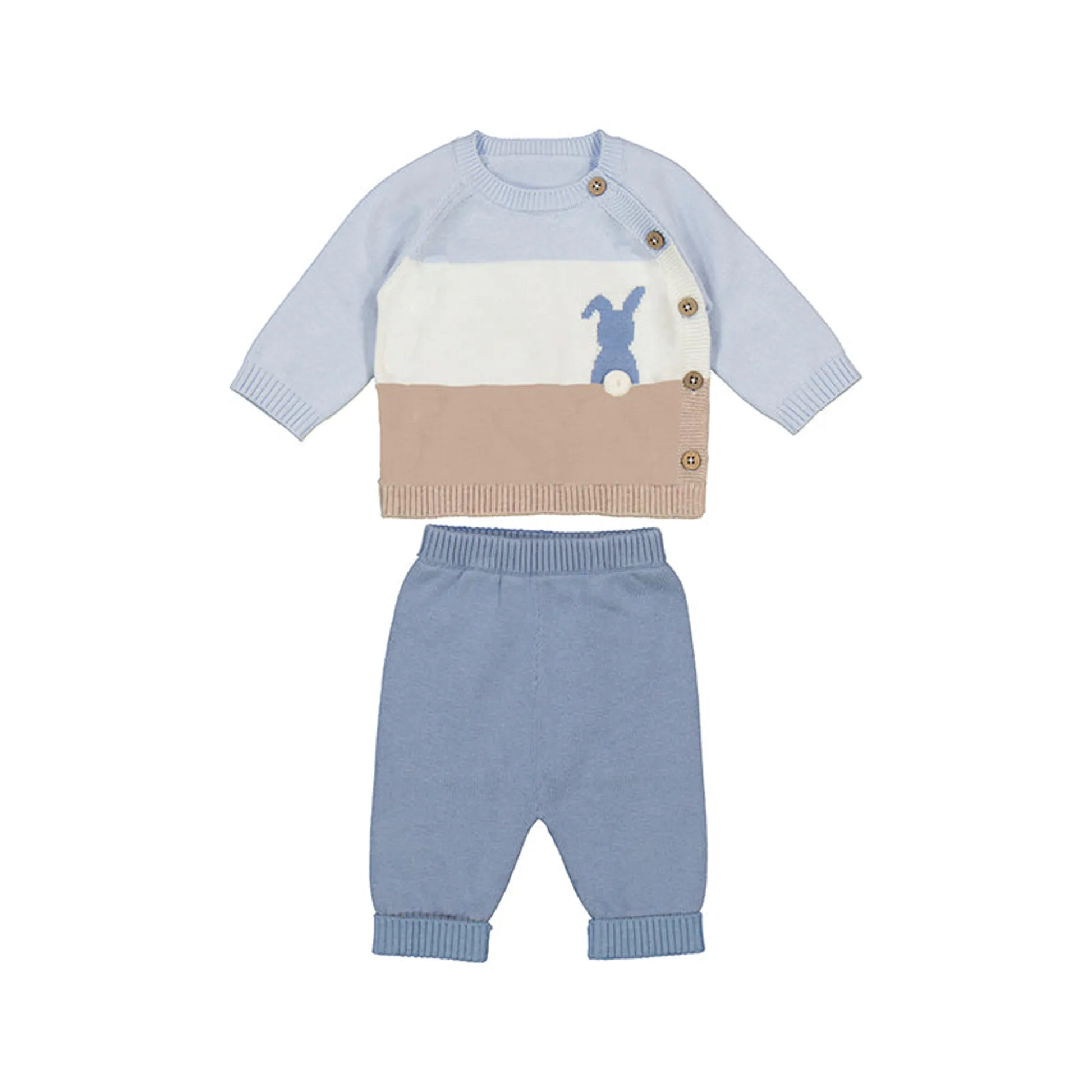 Long sleeved Jumper for newborn. Round neckline. Side fastening with press studs. Decorative elements: pompom. Jacquard stitch designs. Intarsia woven design technique. Trousers for newborn. Elasticated waistband. Knitted fabric, soft and pleasant to the touch. Upturned hem.