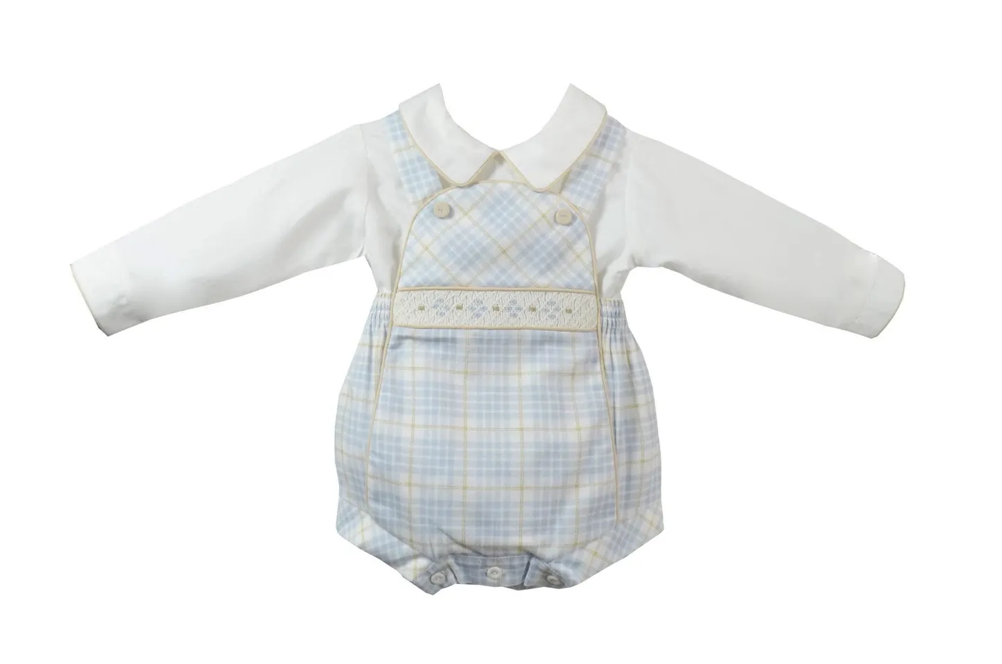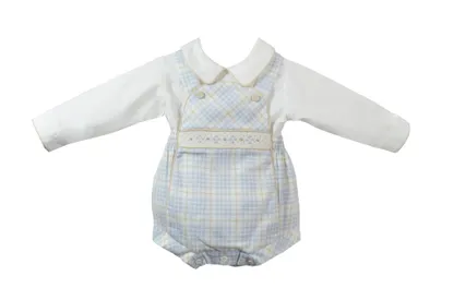 Stunning baby boys outfit in neutral beige and blue tones with long sleeved button up back shirt