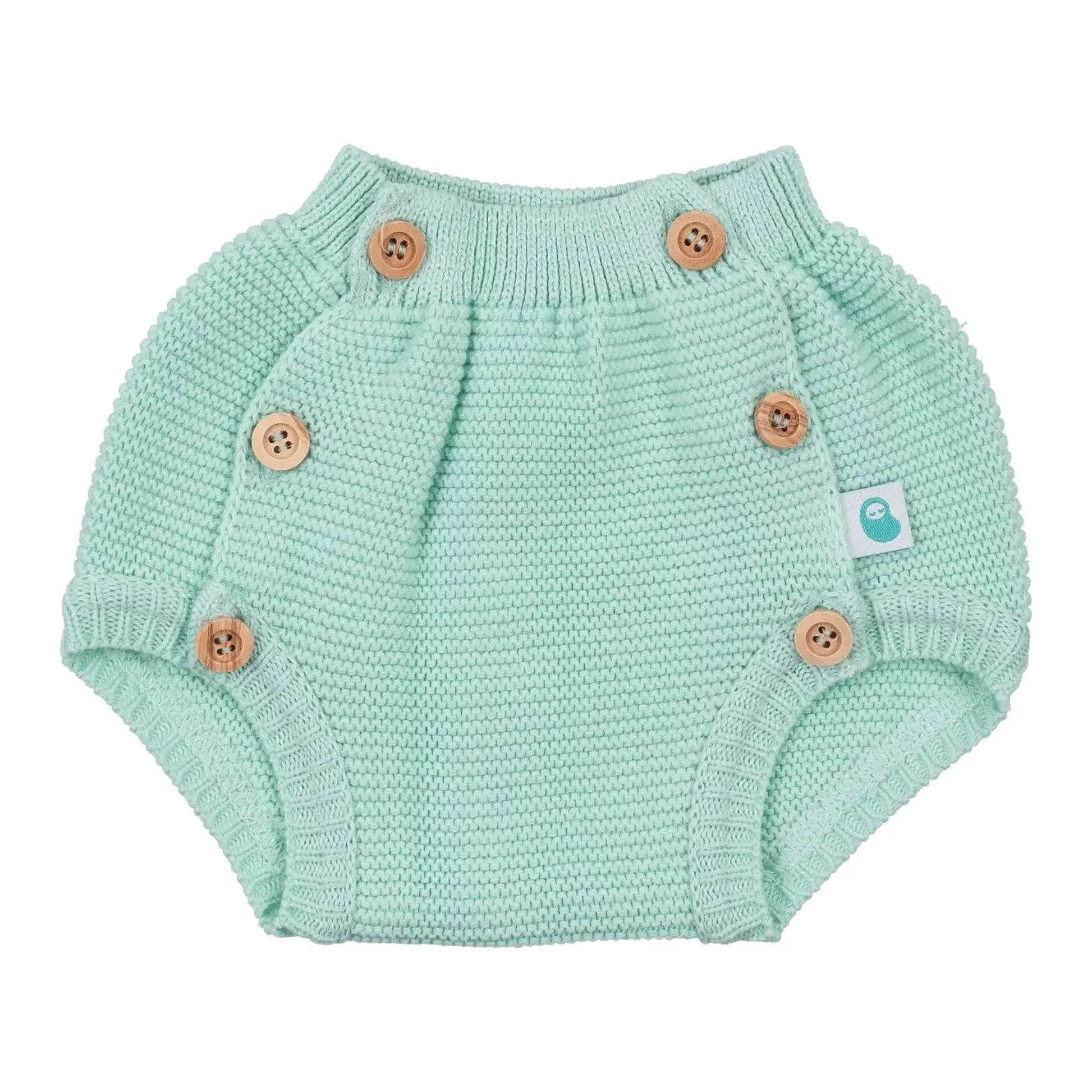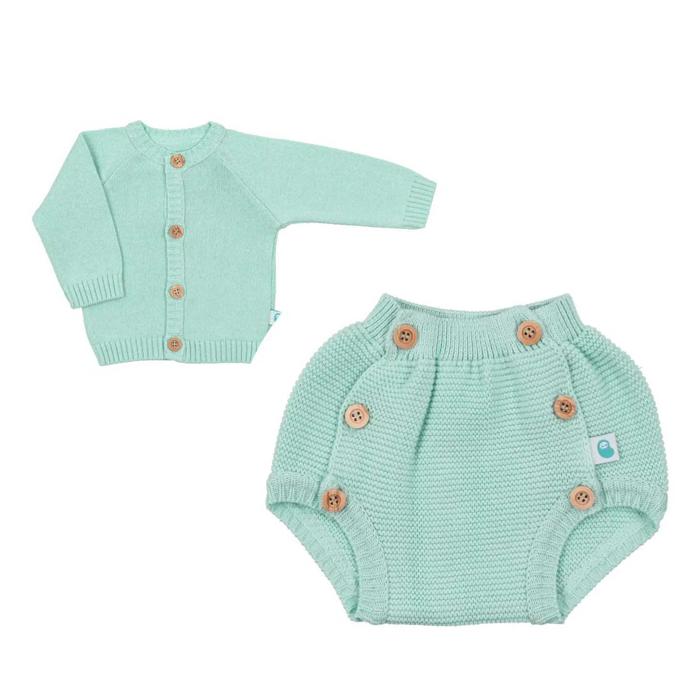 100% Cotton Water Green knitted cardigan and matching diaper set detailed with wooden buttons.