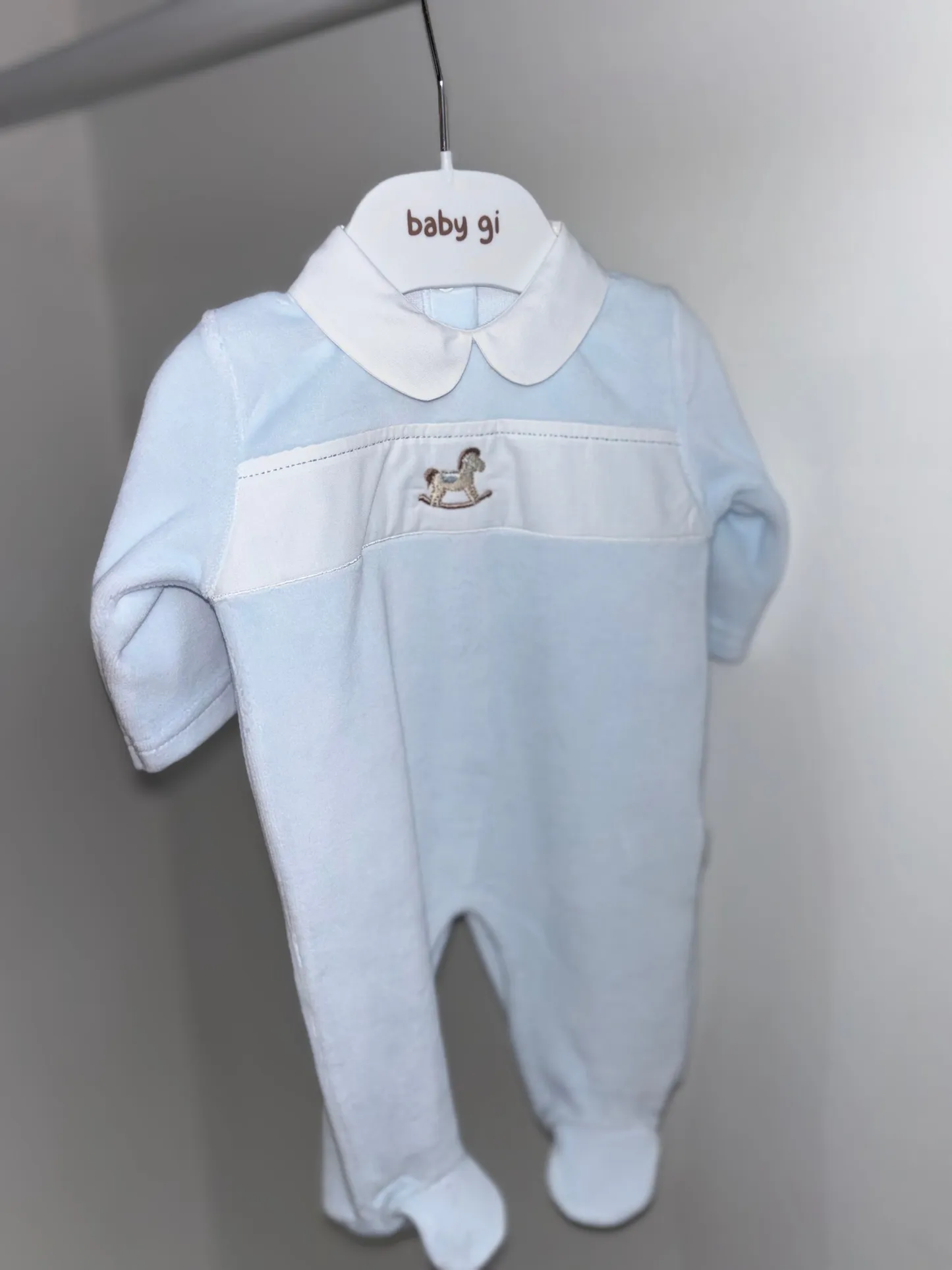 Stunning velour聽sleepsuit from Baby Gi with rocking horse embroidery. Matching bib available separately. Made in Portugal. 80% luxury cotton. Matching accessories bib and blanket available as a gift set of individual. Also comes in pink.