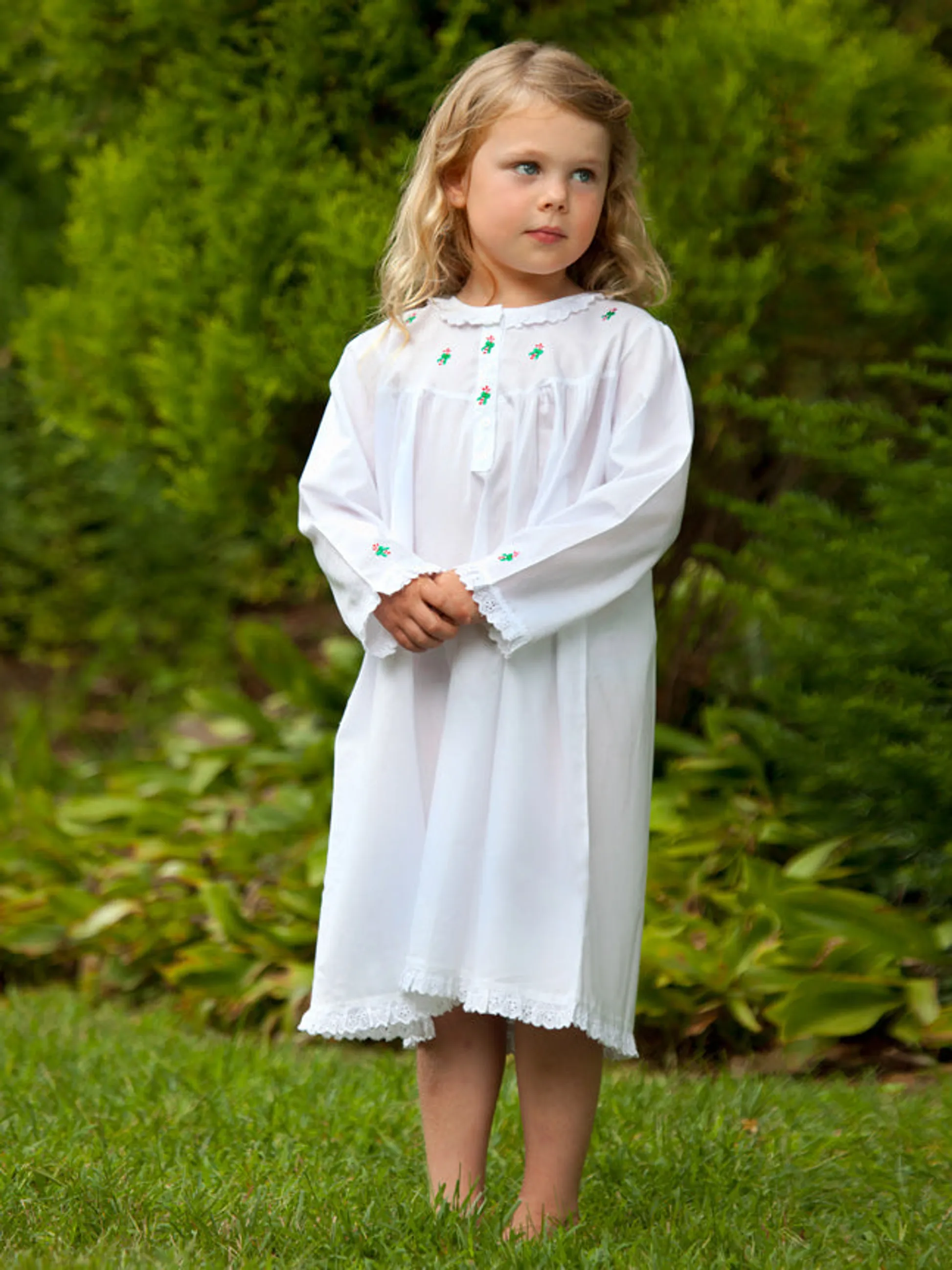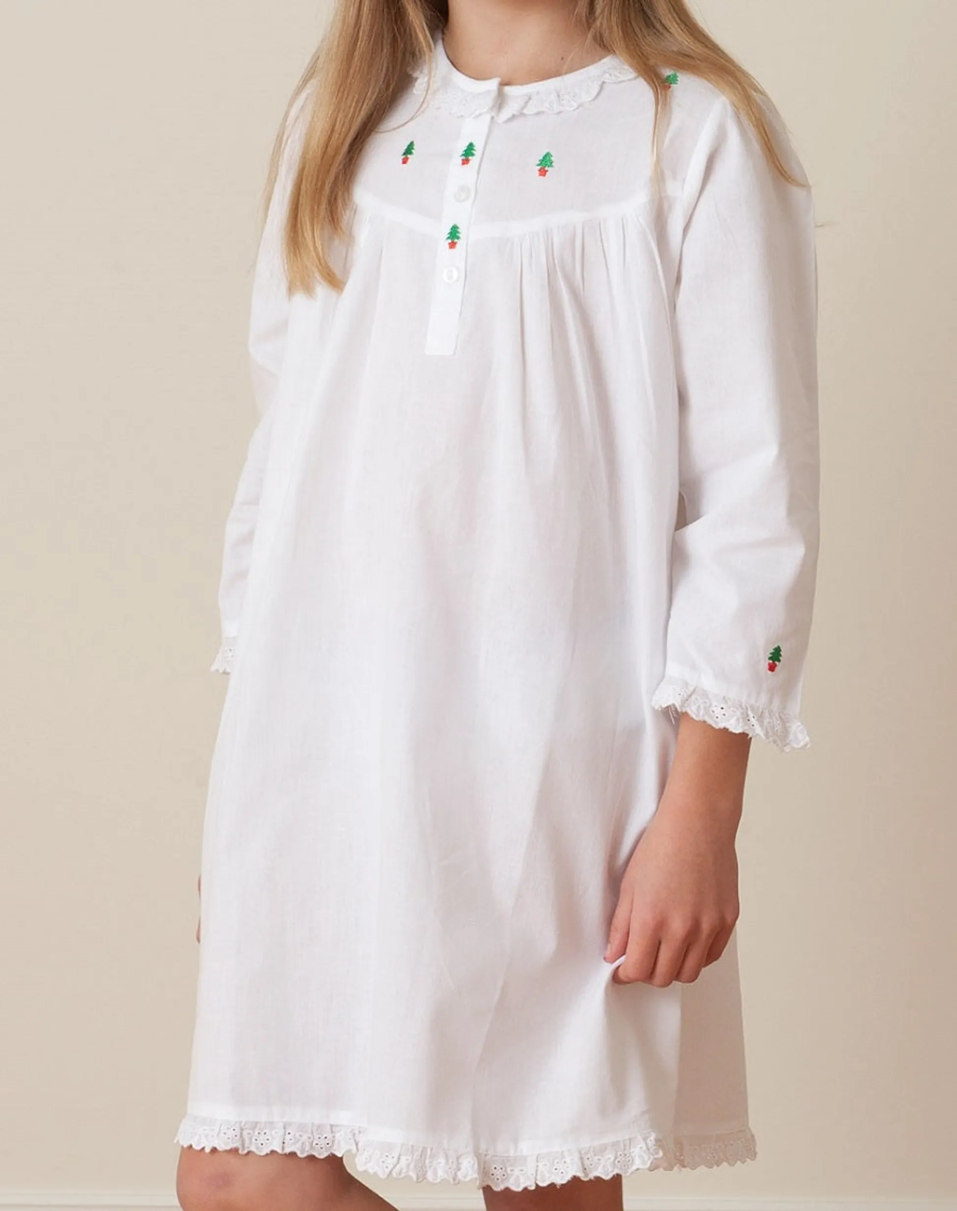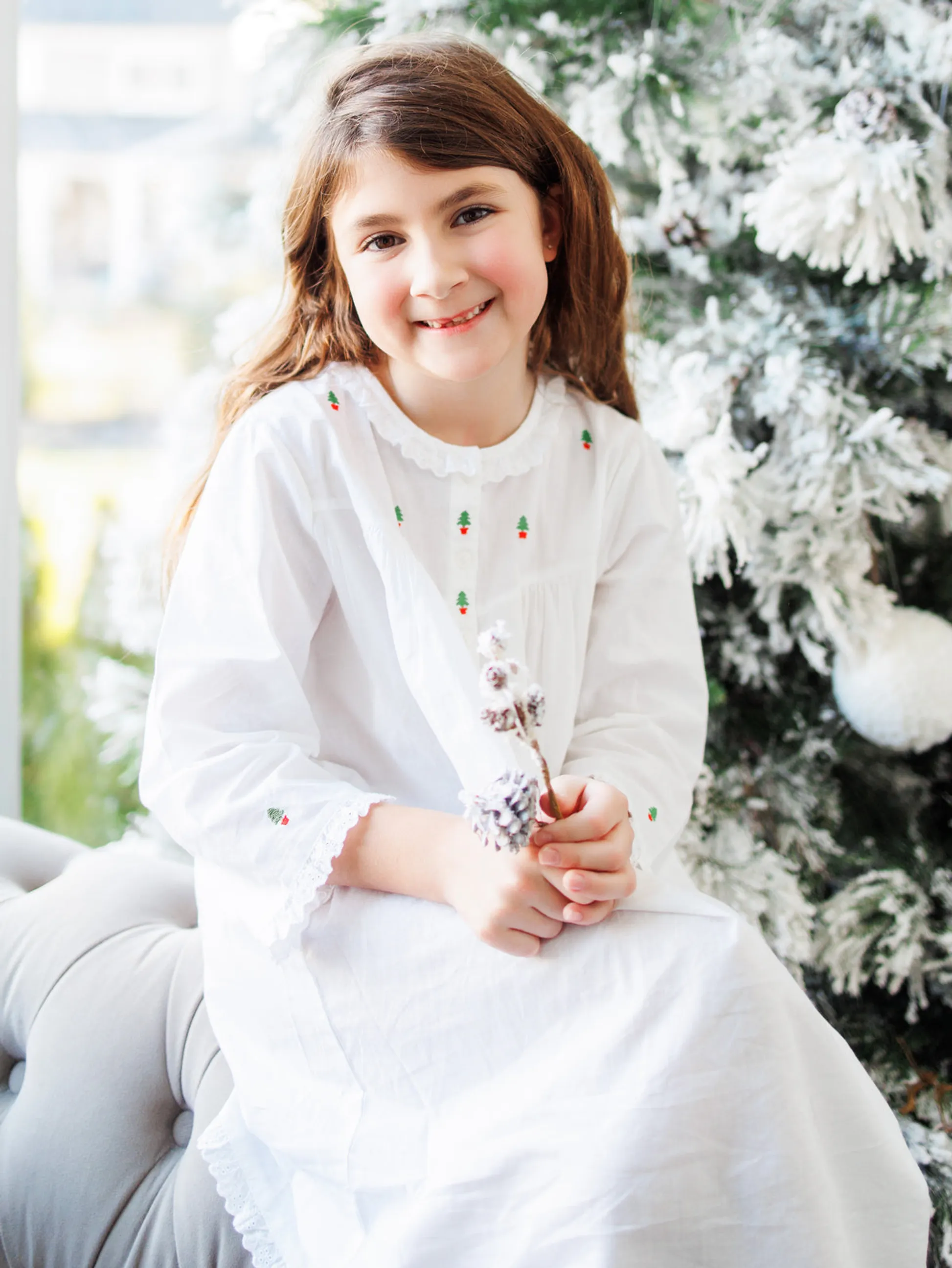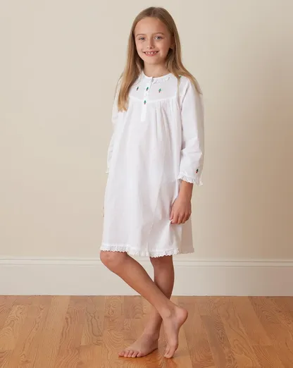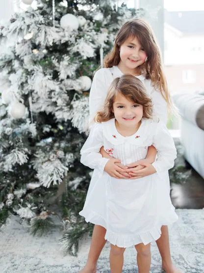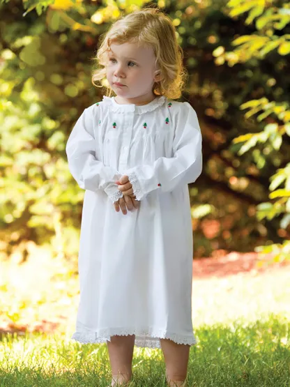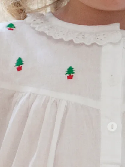 Get her holiday-ready in this charming white cotton dress with delicate Christmas tree embroidery. Soft, breathable, and beautifully made, it’s perfect for opening presents, family photos, or festive gatherings. Long sleeves, three front buttons, and lace trim add a timeless touch she’ll love.