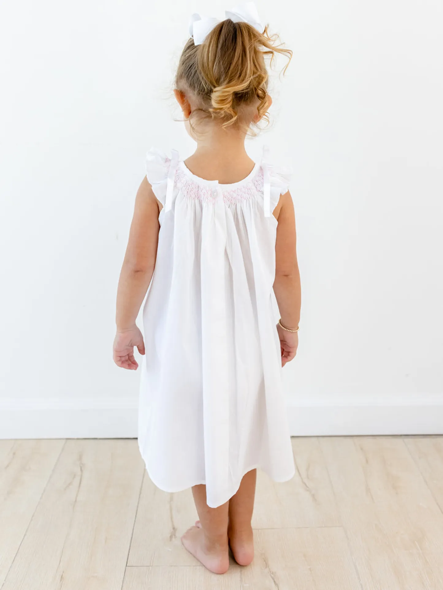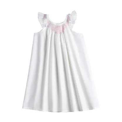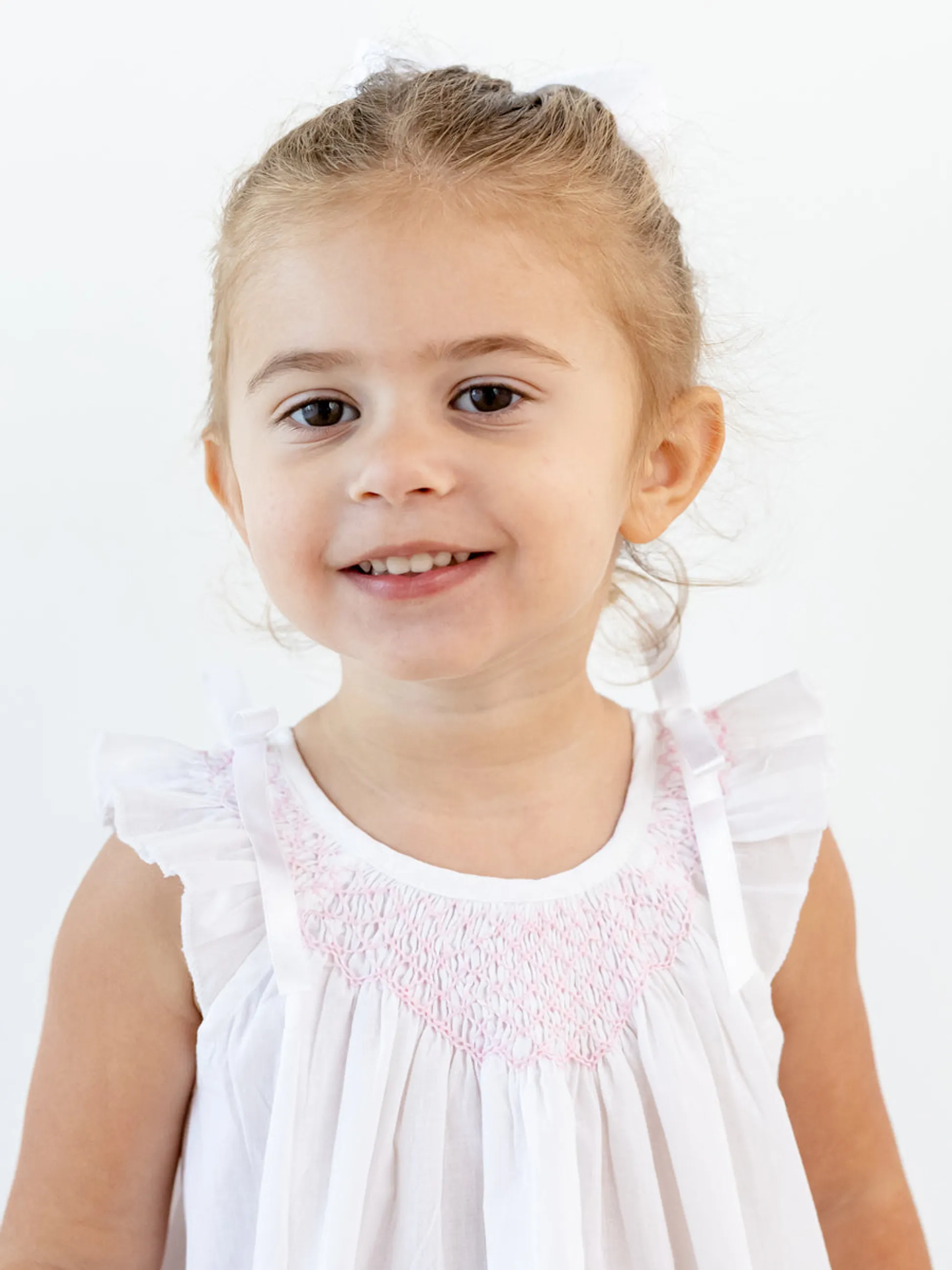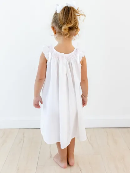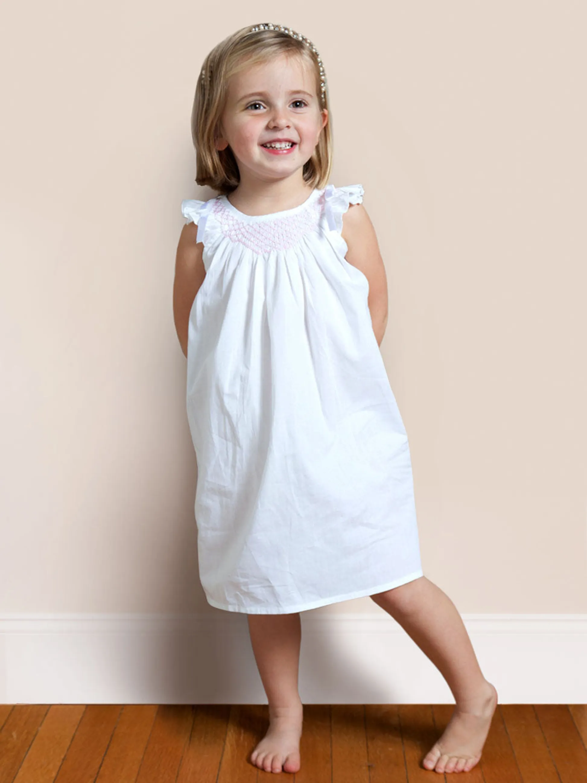 This dress is for Little Girls at play time, girl time, story time or twirl time! Made from soft and breathable white cotton, this dress is perfect for a family gathering or a playdate with friends. The ruffle cap sleeves add a playful touch, while the darling decorative white ribbon ties and pink smocking completes the look. Your little girl will look and feel her best in the Mathilde dress.