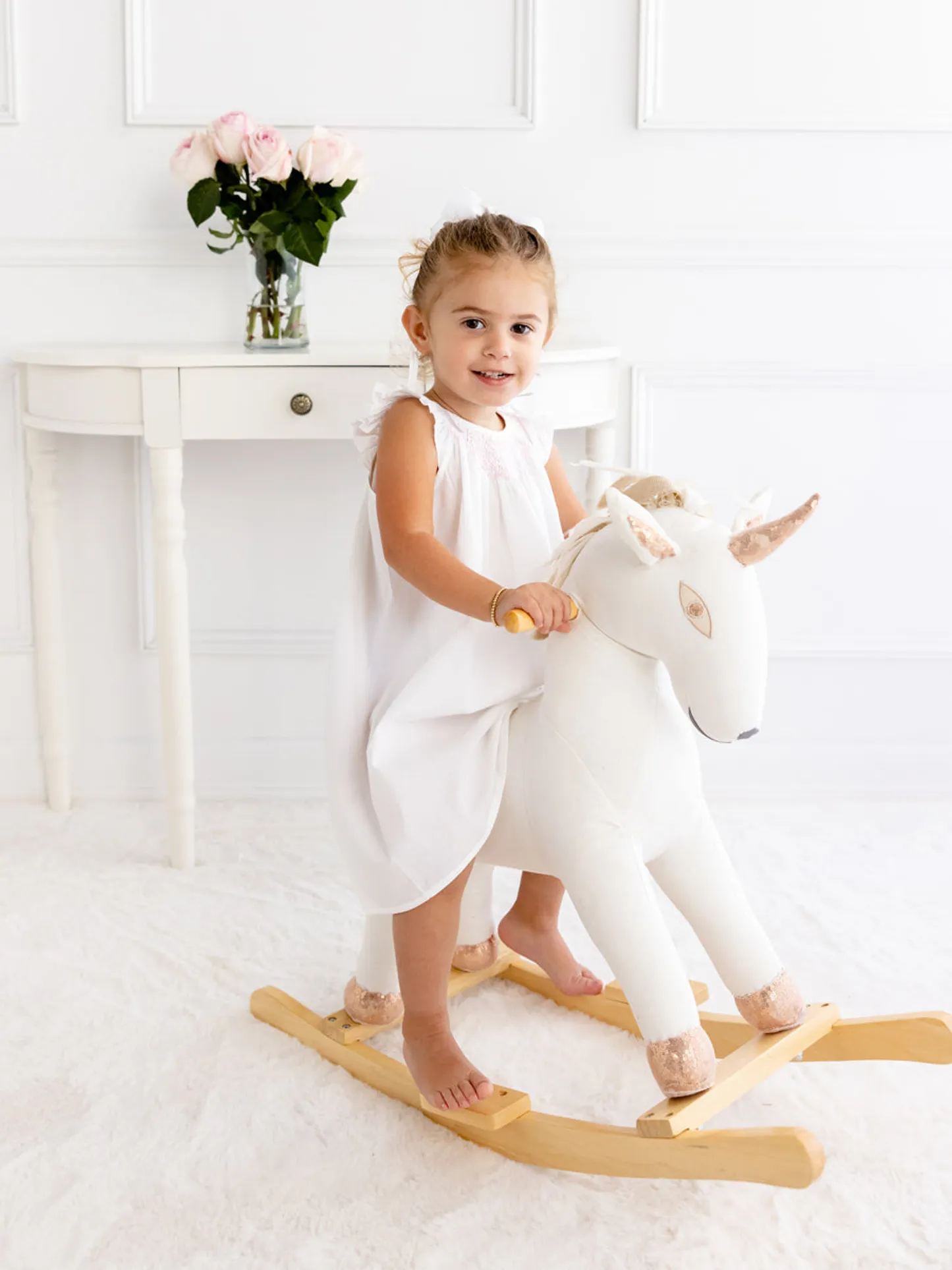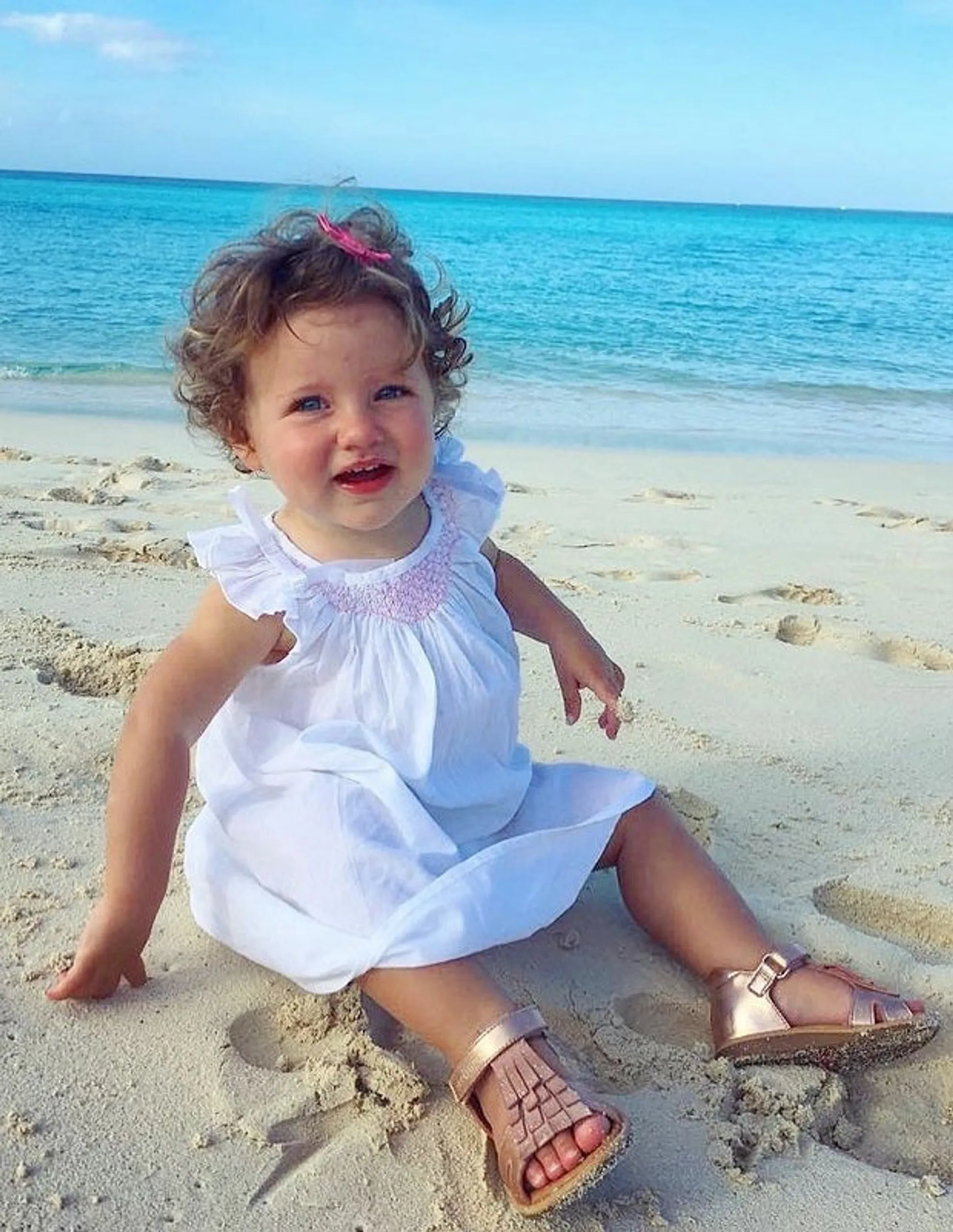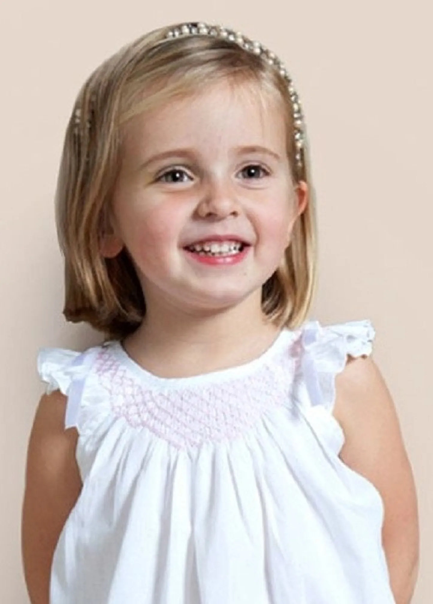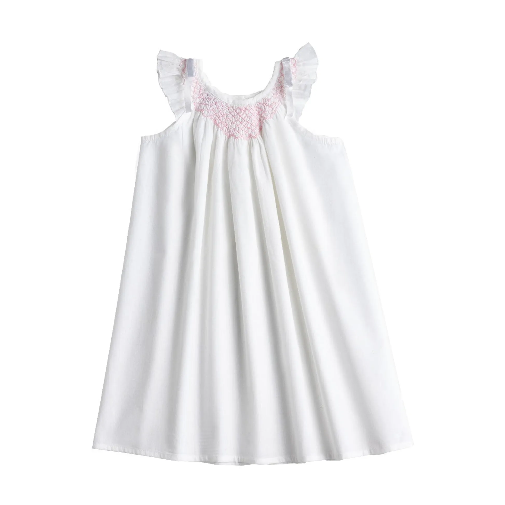 This dress is for Little Girls at play time, girl time, story time or twirl time! Made from soft and breathable white cotton, this dress is perfect for a family gathering or a playdate with friends. The ruffle cap sleeves add a playful touch, while the darling decorative white ribbon ties and pink smocking completes the look. Your little girl will look and feel her best in the Mathilde dress.