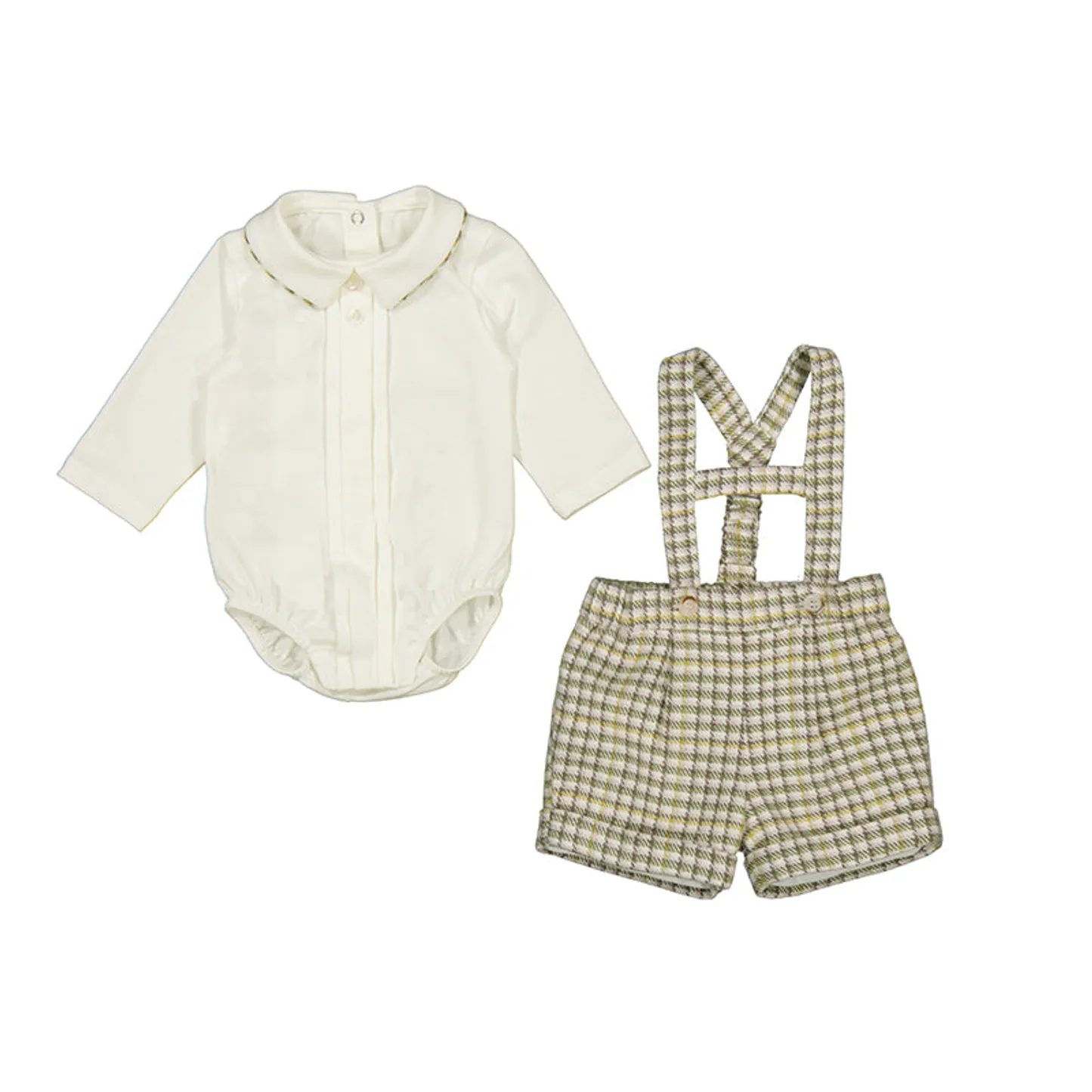 Long sleeved shirt vest with popper buttons to the back and bottom. Coordinating trimmed collar to match shorts. Featuring olive green checkered pattern shorts with suspender details. Matching sisters dresses and older brother sets also available.