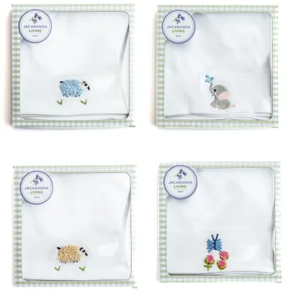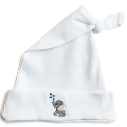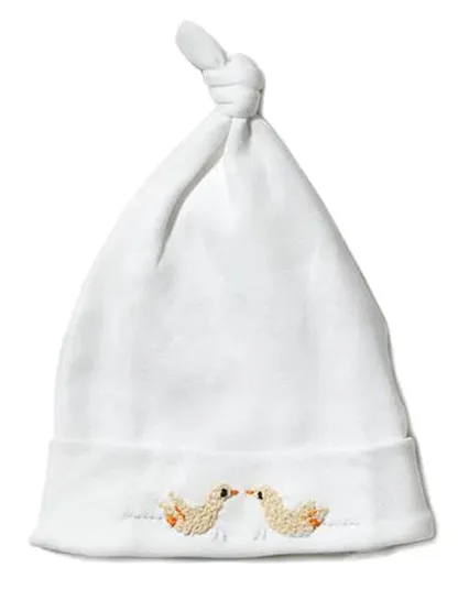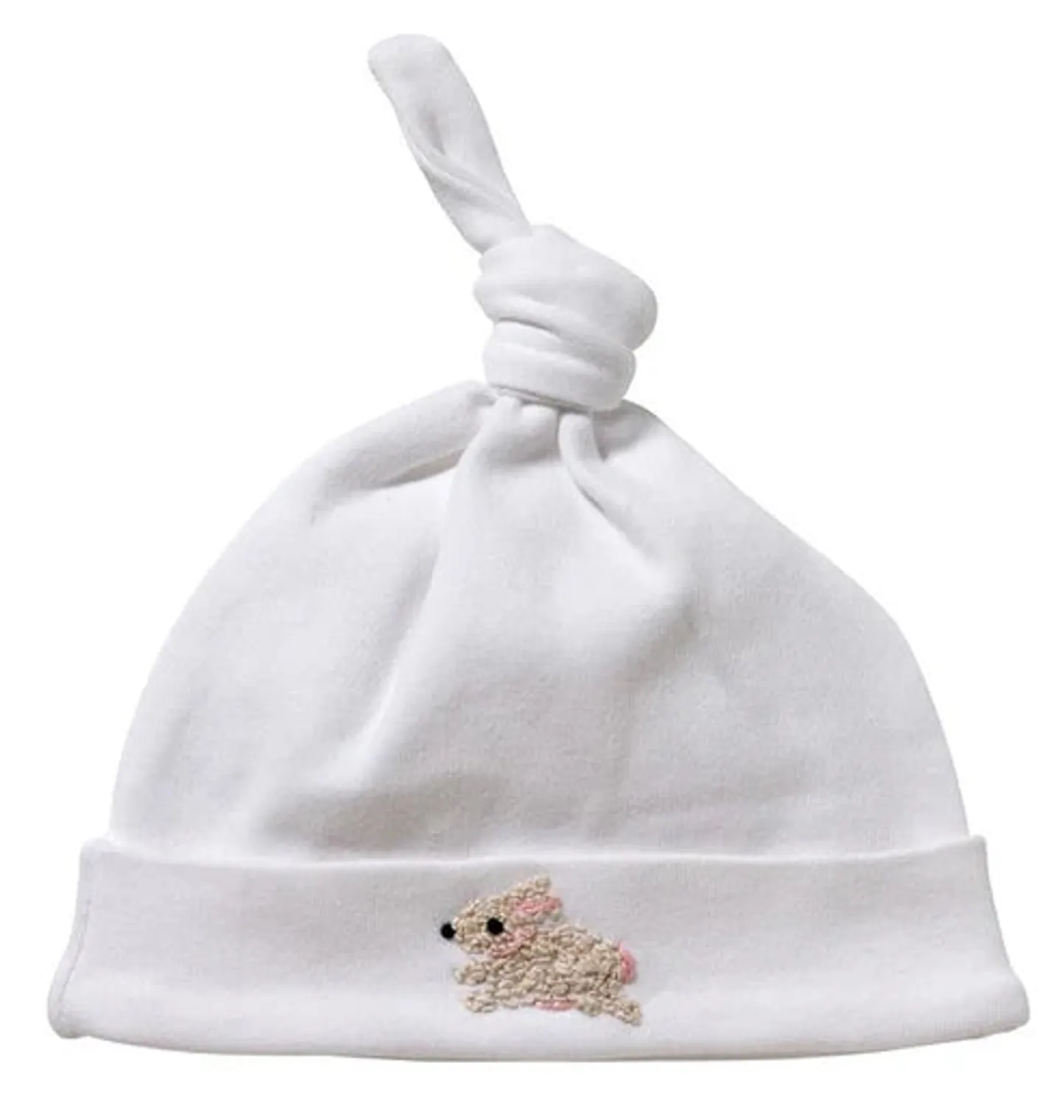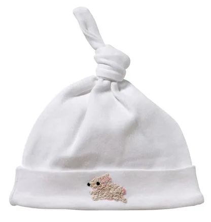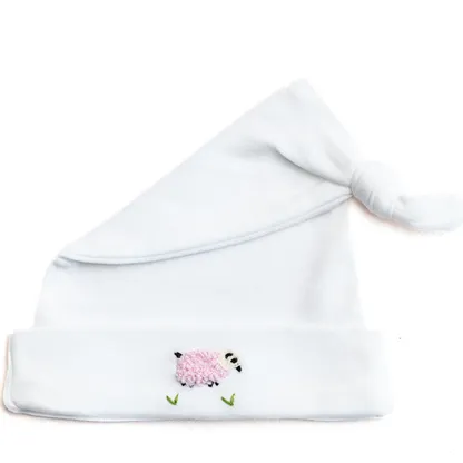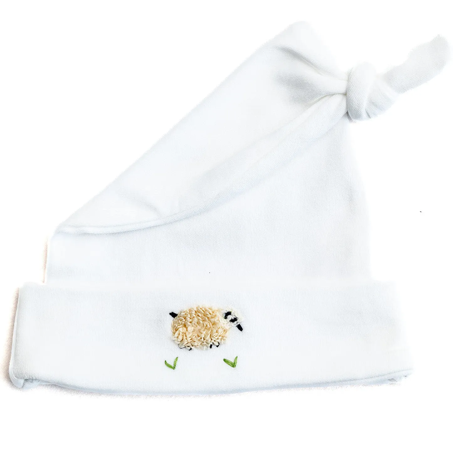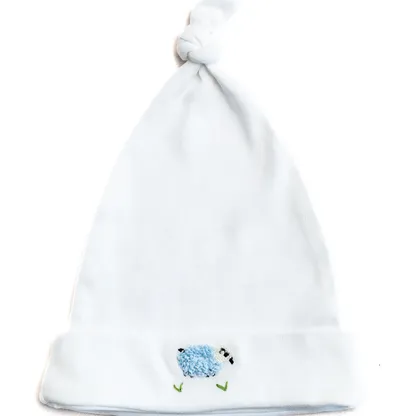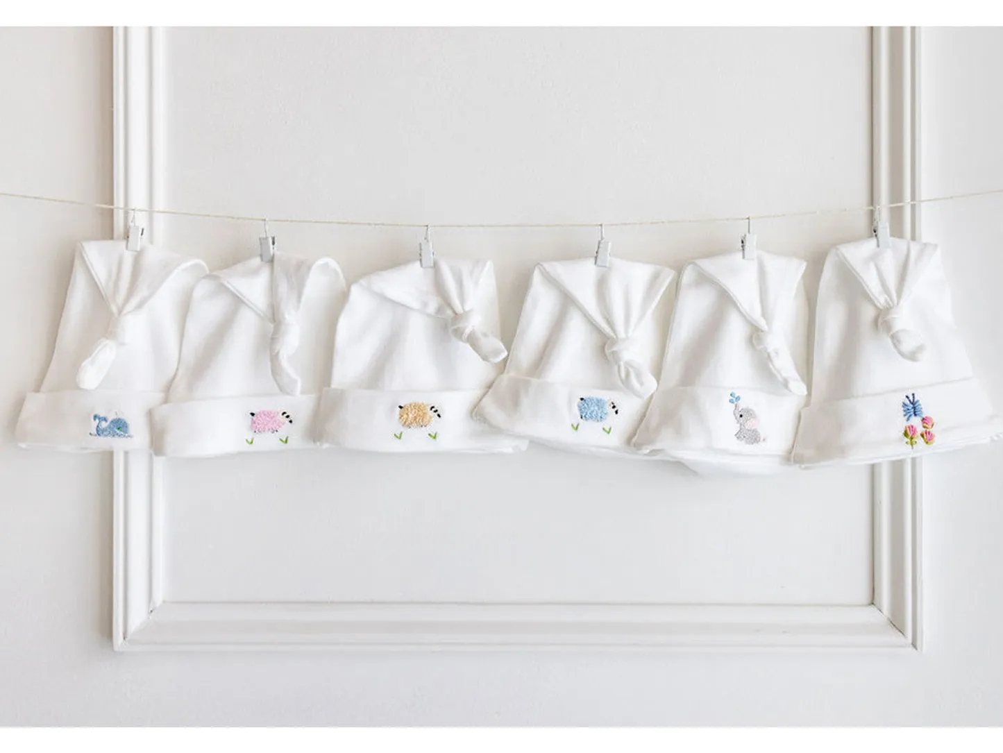 Super-soft combed cotton baby hats with a sweet knotted top and delicate embroidery. Available in bouclé designs (Sheep, Whale, Elephant) or hand-embroidered classics (Rosebuds, Butterfly). Perfect for newborns, infants, and thoughtful baby gifts.