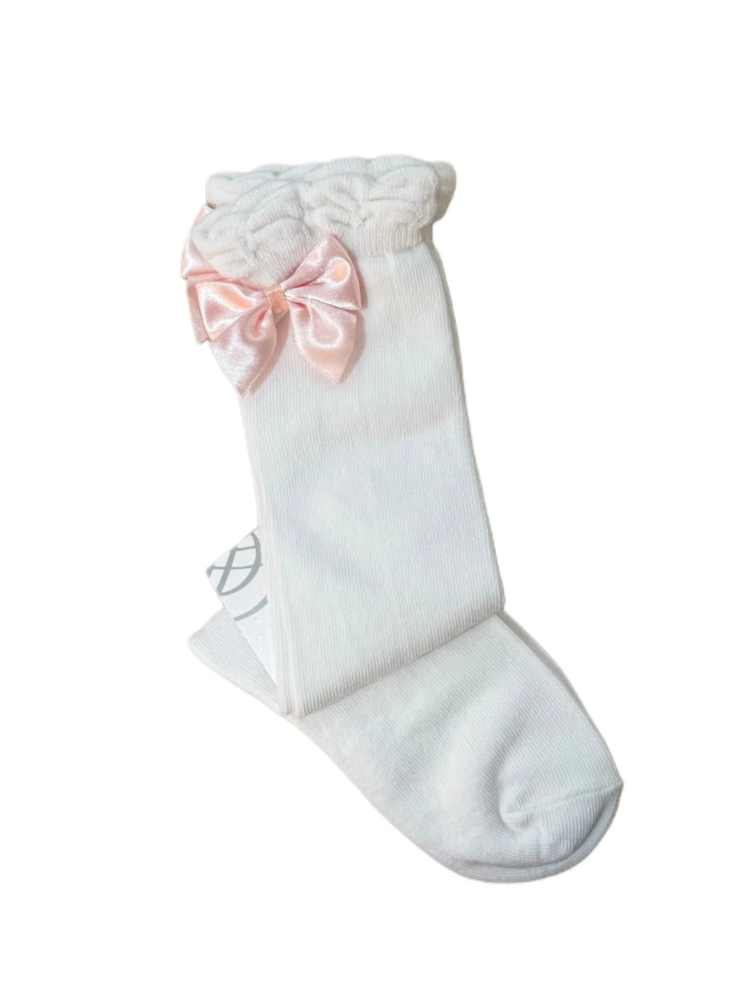 Beautifully soft, cotton-rich white knee high sock with a gently ruffled edge and a lovely pastel pink ribbon bow at the back. Superb quality and super-cute! Size is based on shoe size