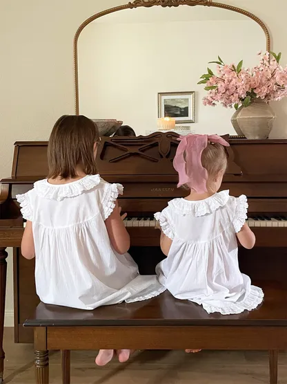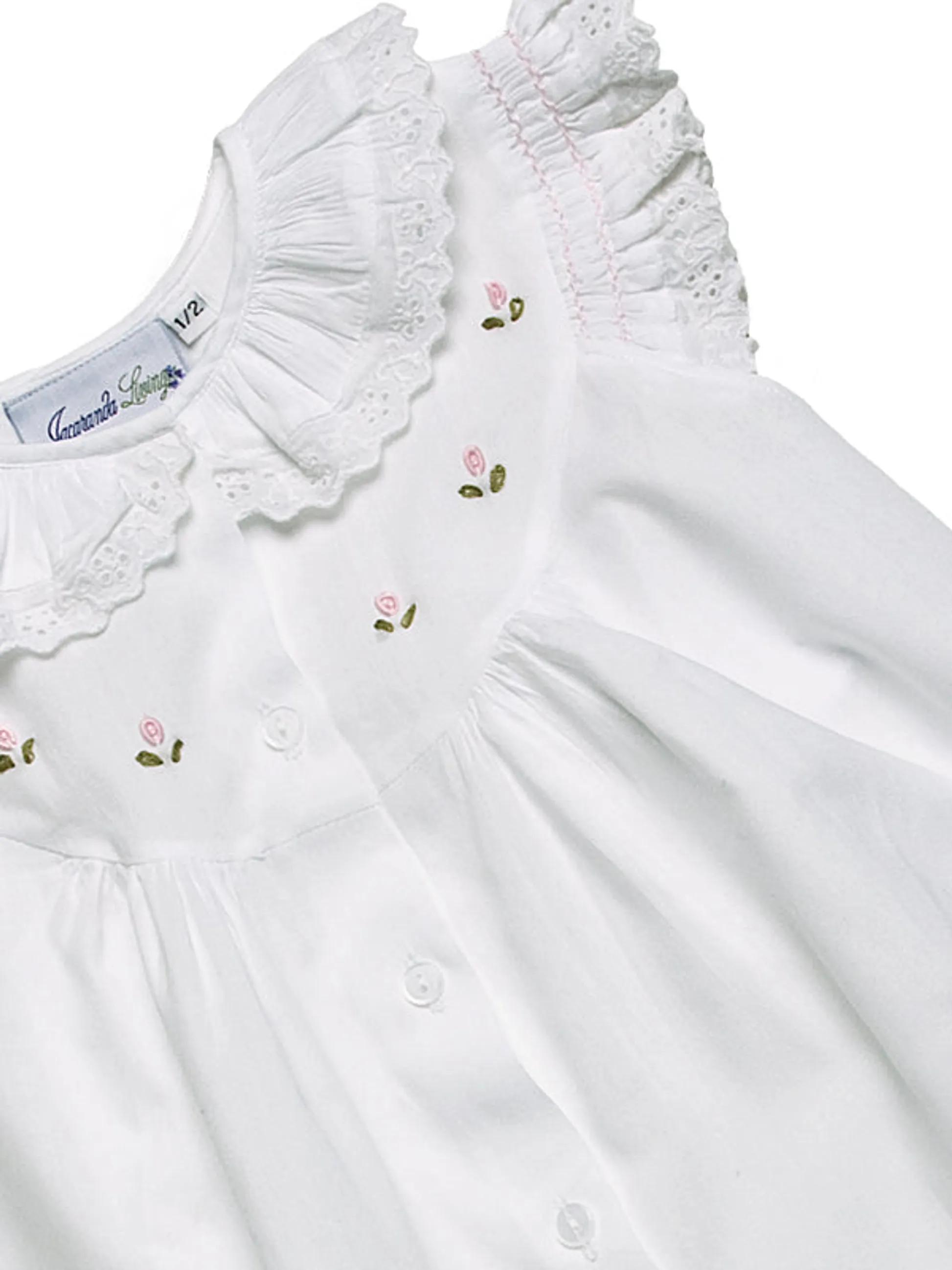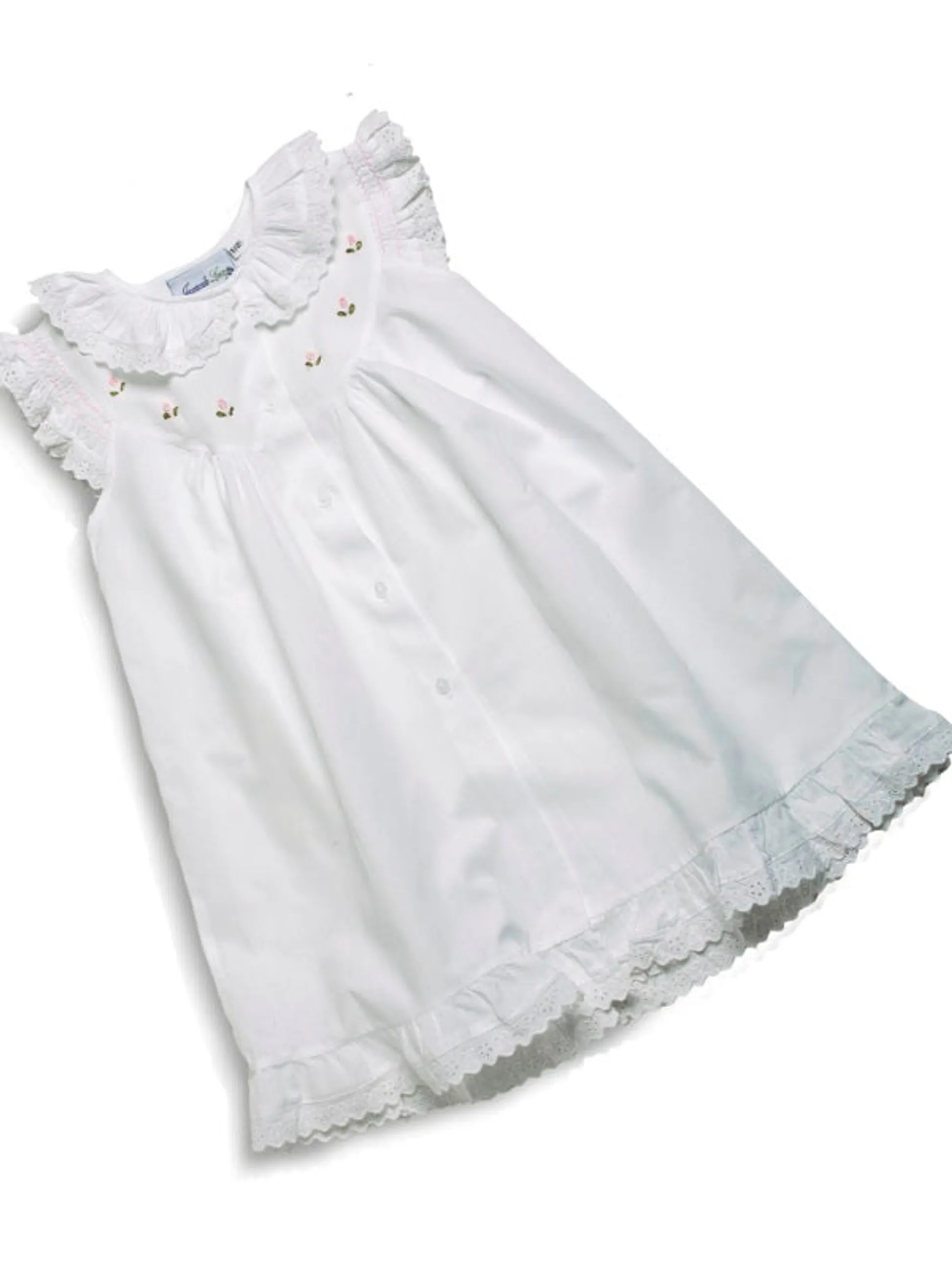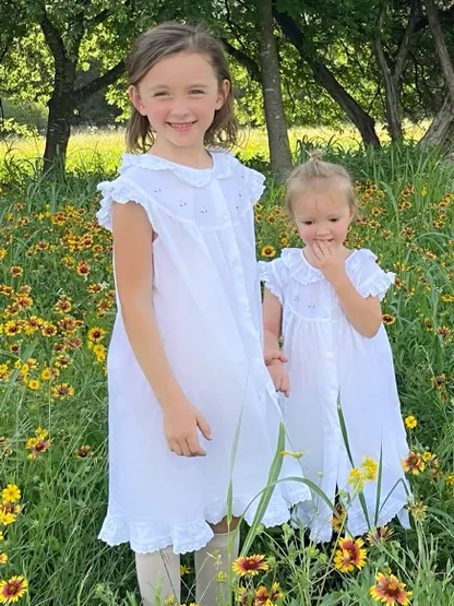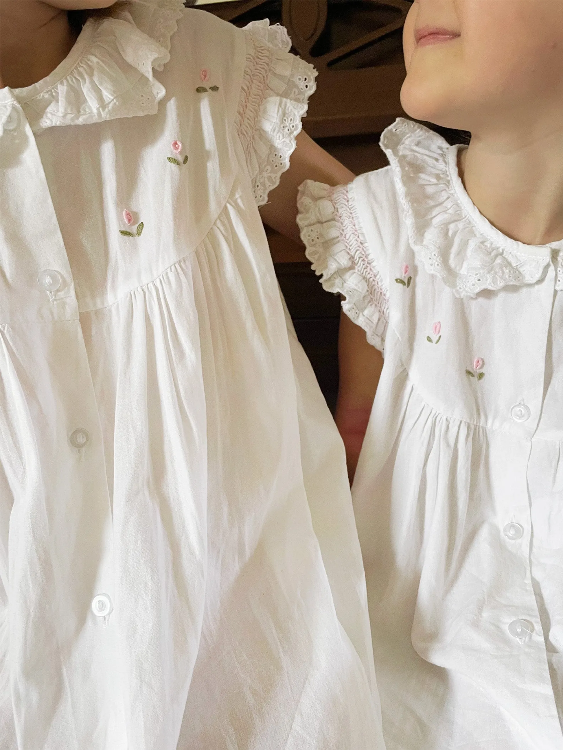 The Gracie Dress is a sweet spring and summer favorite, featuring butterfly sleeves, ruffled eyelet lace, and hand-embroidered pink rosebuds on the bodice. Soft, elegant, and easy to wear, it’s perfect for playdates, parties, and everything in between.