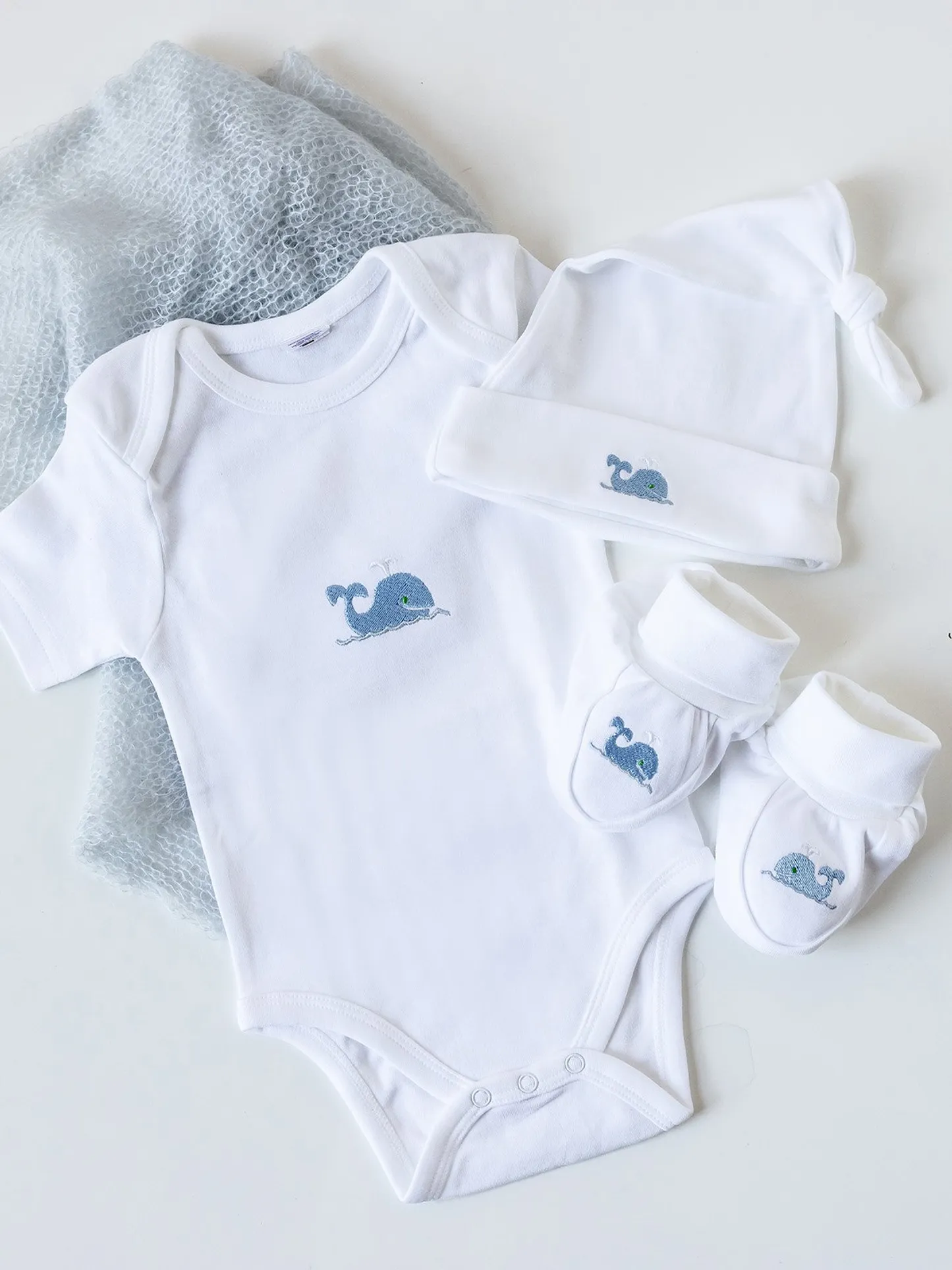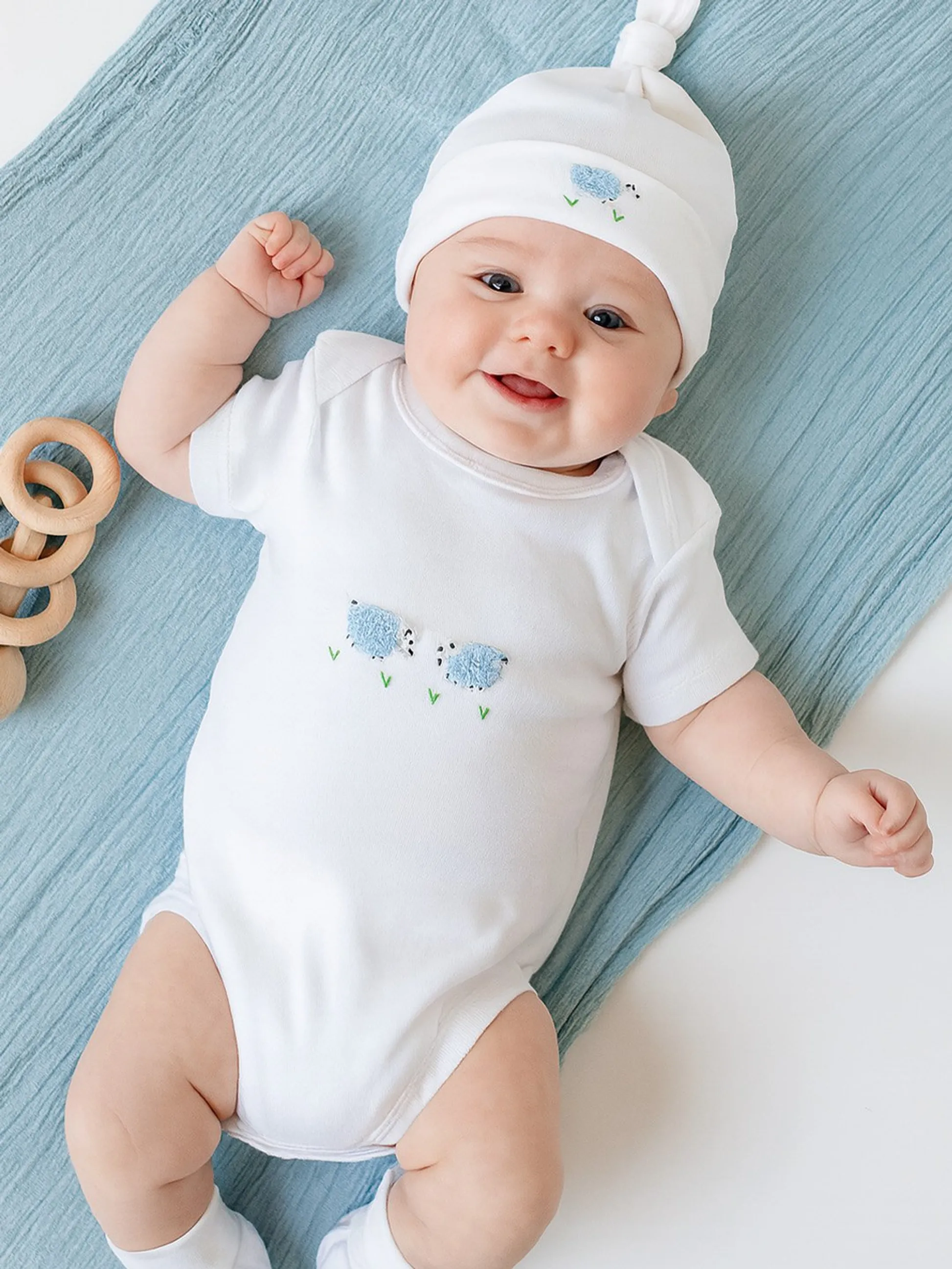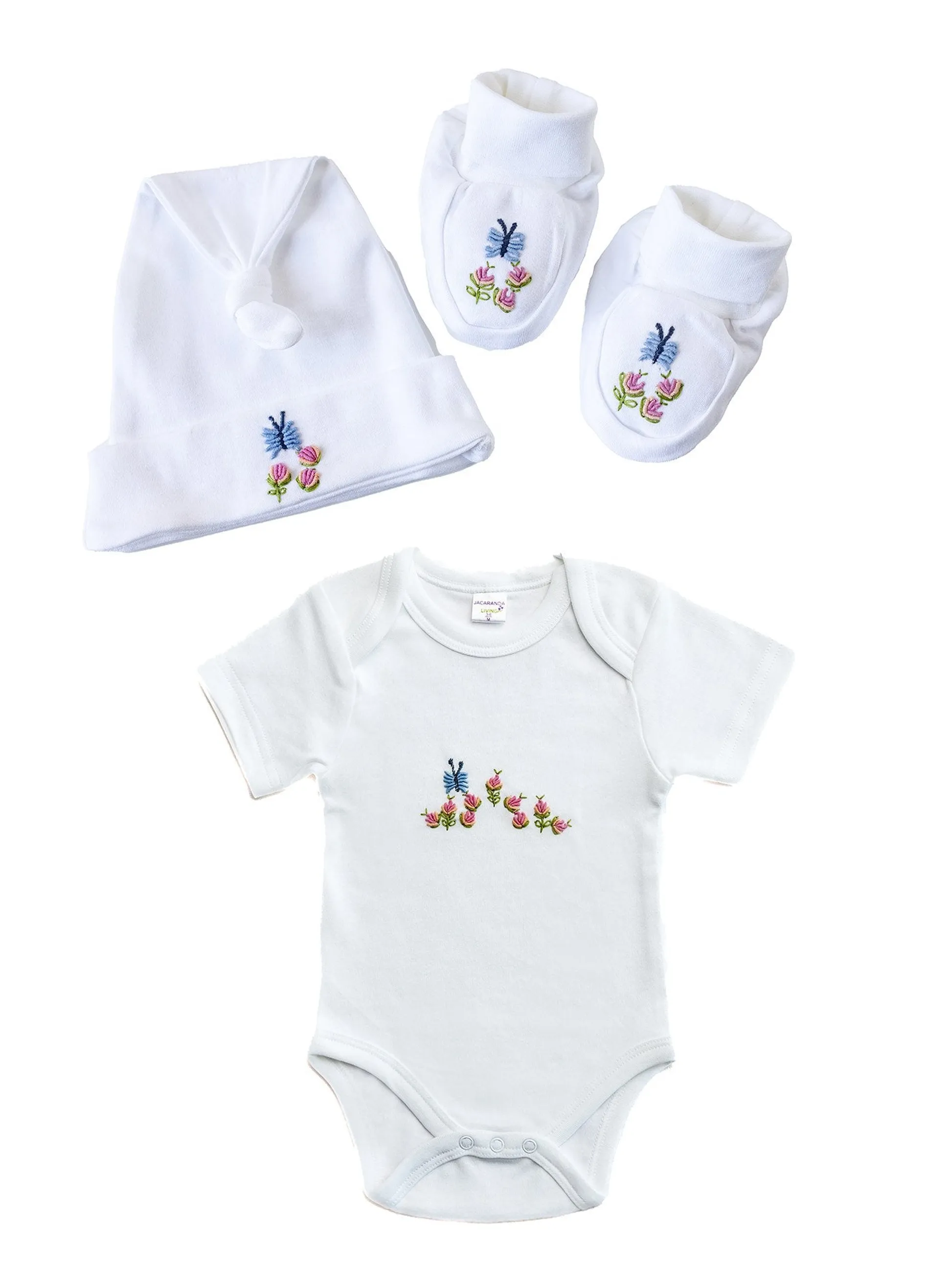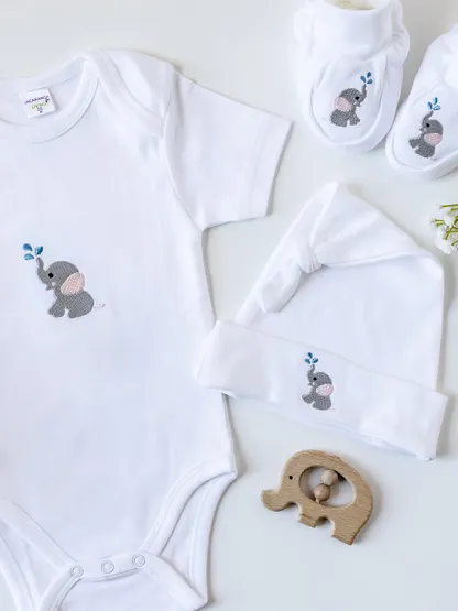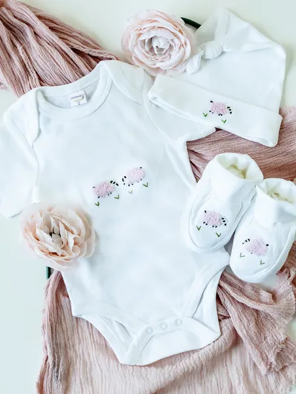Dress your little one in comfort and charm with our embroidered bundle — a short sleeve onesie, matching knotted hat, and cozy booties. Choose from any of our sweet embroidered designs and save 15% when you bundle these baby essentials.
